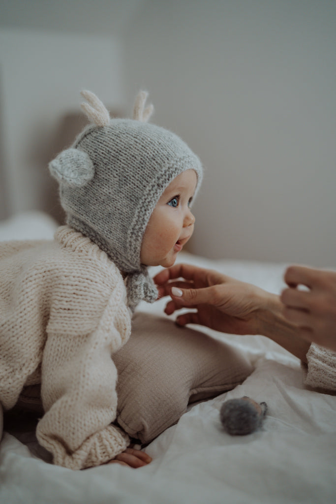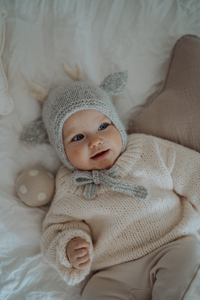 Adorable and practical, this hand-knitted deer bonnet is made from soft, fluffy yarn that keeps your baby cozy and warm. Designed in a classic bonnet style, it ties securely under the chin and fully covers the ears, protecting little ones during colder days.