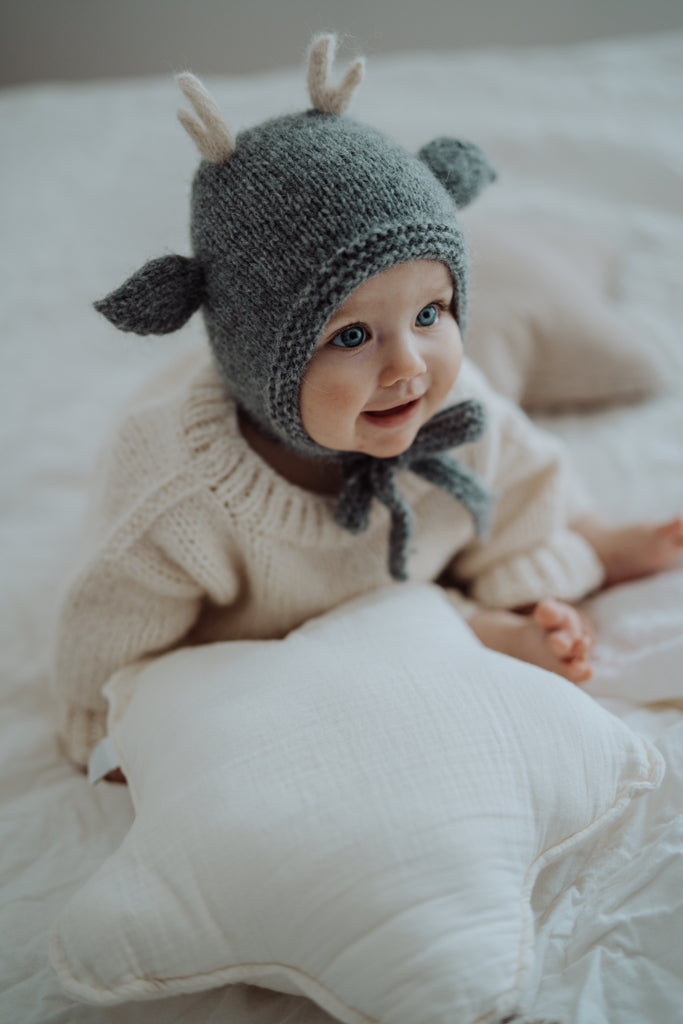 Adorable and practical, this hand-knitted deer bonnet is made from soft, fluffy yarn that keeps your baby cozy and warm. Designed in a classic bonnet style, it ties securely under the chin and fully covers the ears, protecting little ones during colder days.