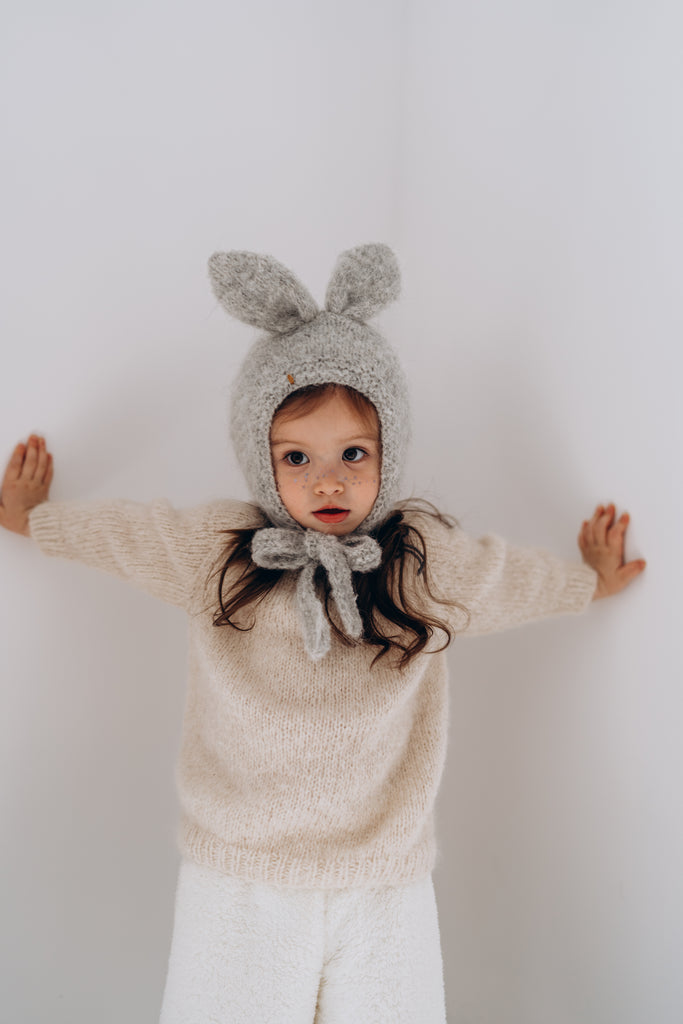 Soft knitted bunny hat. Bonnet tied under the neck, covers the ears and is very flexible. The original shape and funny ears makes baby look like little bunny. Natural blend of alpaka and merino wool add soft and cozy facture of bonnet hat.