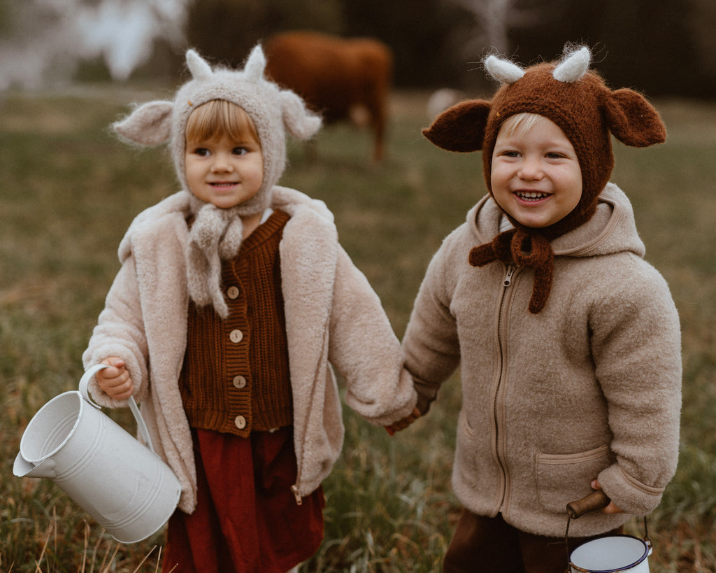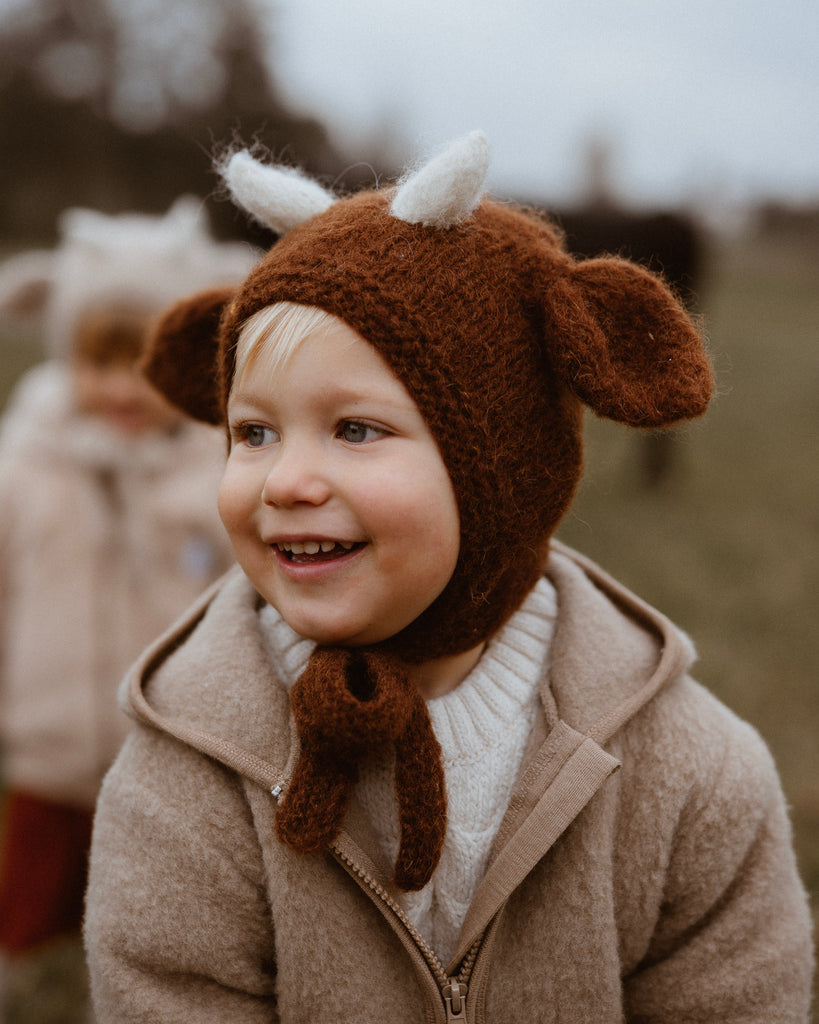This hand-knitted Moo Cow bonnet is made from luxuriously soft, fluffy yarn to keep your little one warm and comfortable. Designed in a classic bonnet style, it ties gently under the chin and fully covers the ears, providing perfect protection on chilly days.