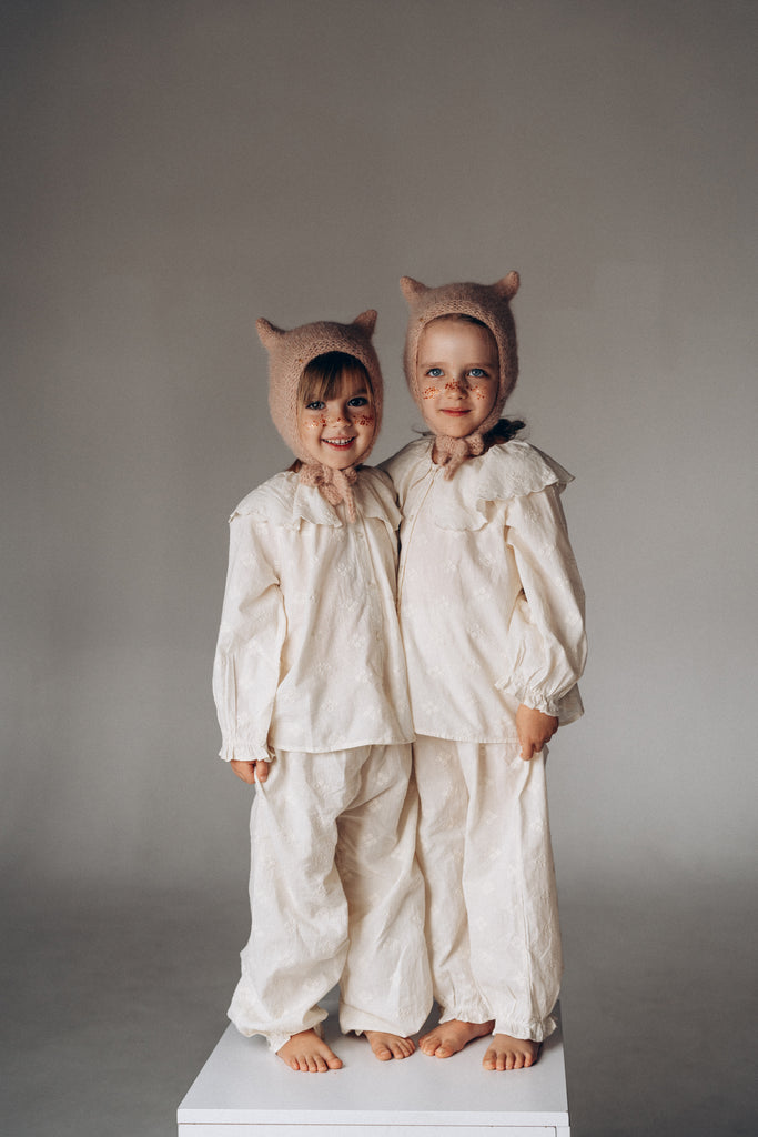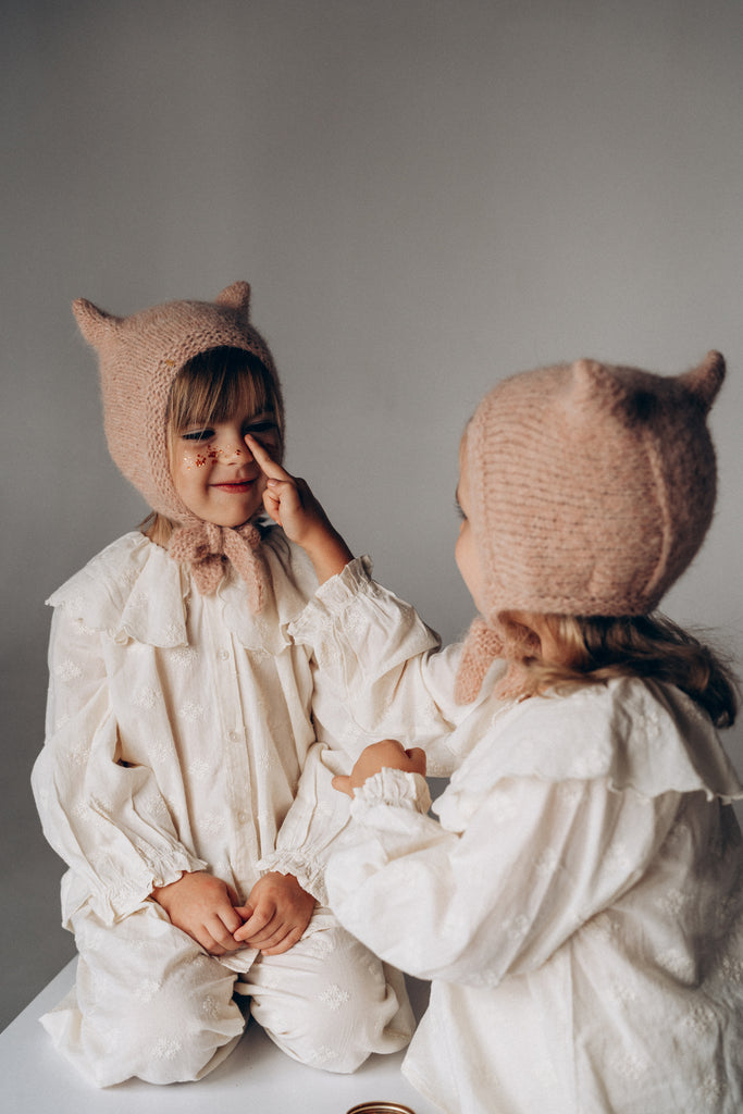 Soft knitted kitty bonnet for baby and toddlers. Bonnet tieded under the neck, covers the ears and is very flexible. The original blend of the best selections of alpaca and silk creates a soft handfeel but at the same time very light baby hat. The characteristic kitty hat shape makes the look of baby adorable and original.