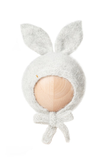 Soft knitted bunny hat. Bonnet tied under the neck, covers the ears and is very flexible. The original shape and funny ears makes baby look like little bunny. Natural blend of alpaka and merino wool add soft and cozy facture of bonnet hat.