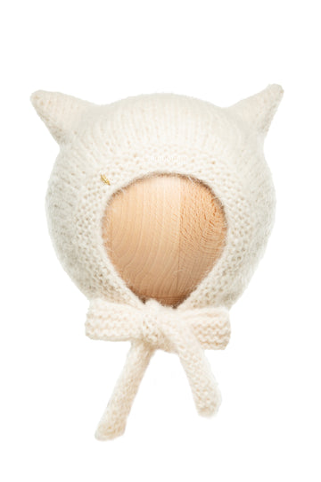Soft knitted kitty bonnet for baby and toddlers. Bonnet tieded under the neck, covers the ears and is very flexible. The original blend of the best selections of light mohair and alpaca creates a soft handfeel but at the same time very light baby hat. The characteristic kitty hat shape makes the look of baby adorable and original.